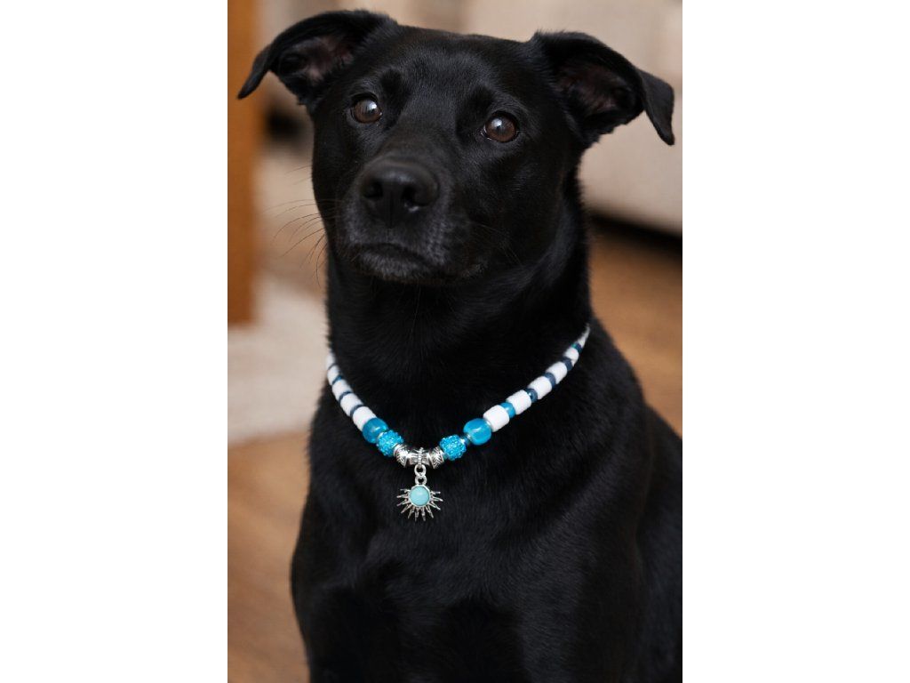 Obojek je vyroben z em keramických trubiček, akrylových, skleněných, keramických a dřevěných korálků a bižuterní oceli. Navlečen na elastické tkanici z plavkoviny.